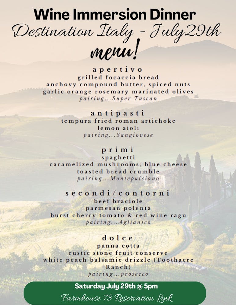 Your limited-seating ticket five three-ounce pours of Italian and Italian-style wines, and a specially crafted menu from appetizer through dessert. Additional wine will be available for purchase upon request.